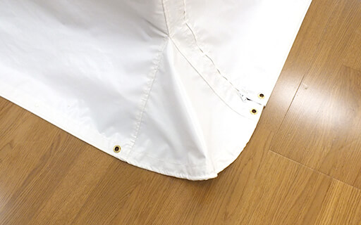 外幕は風によるバタつきを押える為、ハトメを打っています、下部は雨・風の進入を防ぐ為に裾を伸ばした作りになっています。