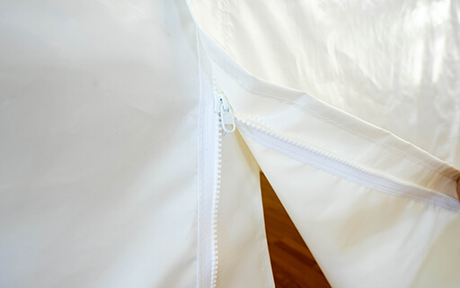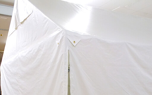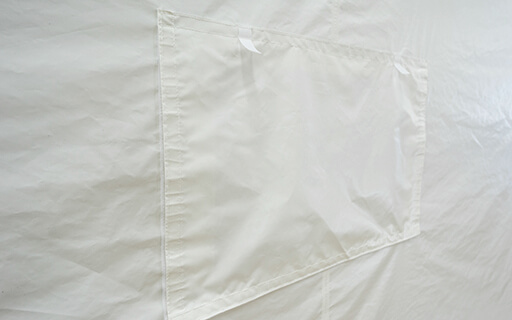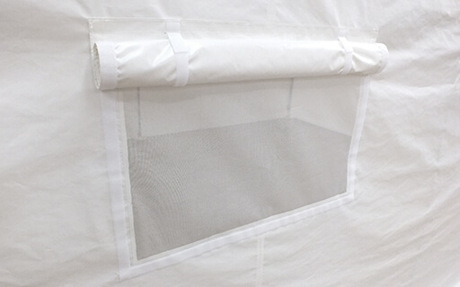 横幕は、ファスナー式の出入口1ヵ所、採光・換気用窓4ヶ所を備えています。