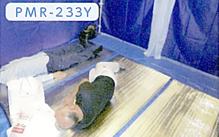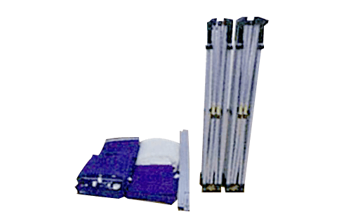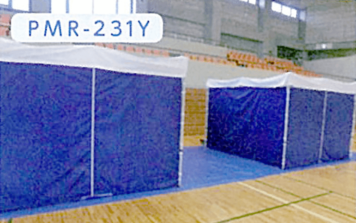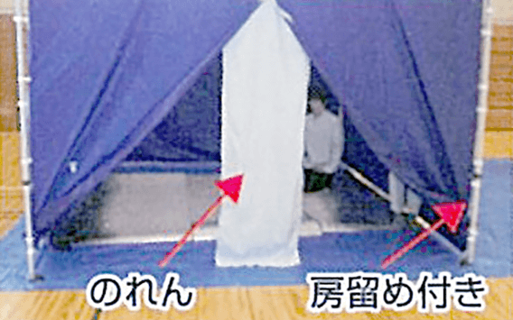 間仕切りテント2棟分の間を補強パイプで繋ぎ、3連棟になります。防災推奨品に認定されました。