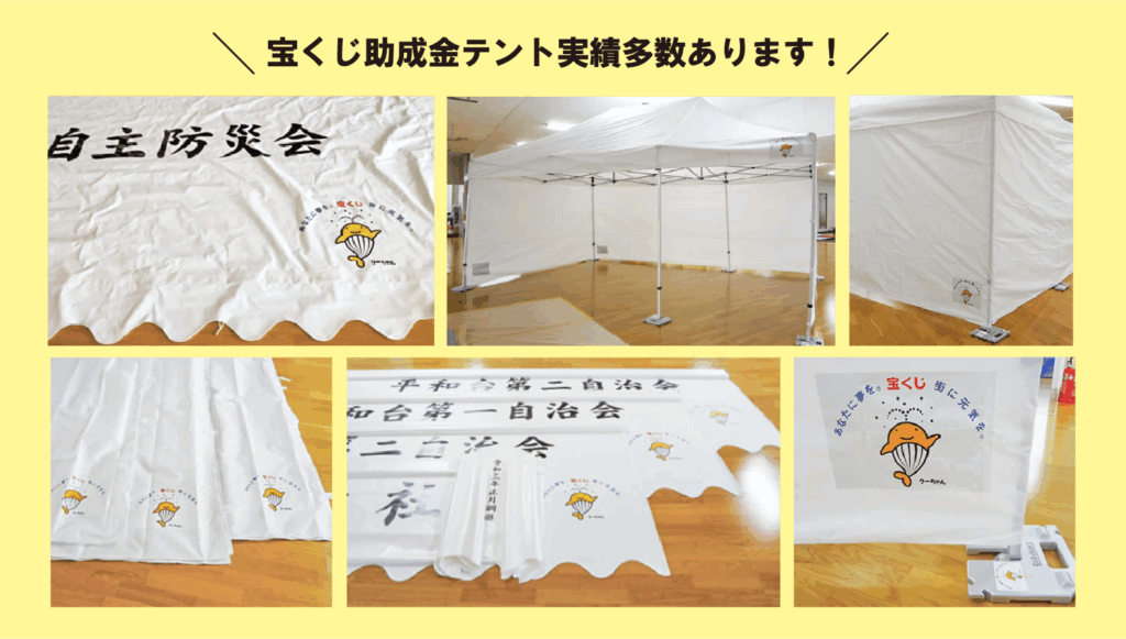 宝くじ助成金、赤い羽根共同募金助成金、各種助成金を利用したイベントテントの購入も可能です。