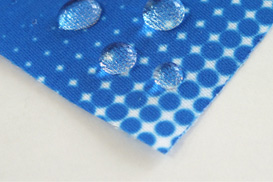 生地の表面に撥水加工を施しているので、水分が生地についてもコロコロと玉状となり、生地がぬれにくくなりますので、飲食物を扱う展示会や屋外でのイベントなどに向いています。