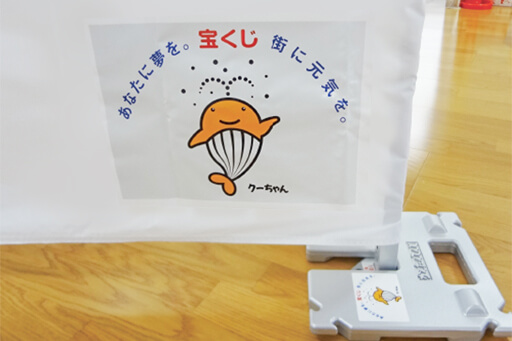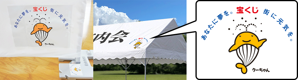 - 宝くじの社会貢献「広報事業」となりますので、テント天幕、横幕、重り等、全てに「宝くじマーク」を入れる事が義務付けられています。